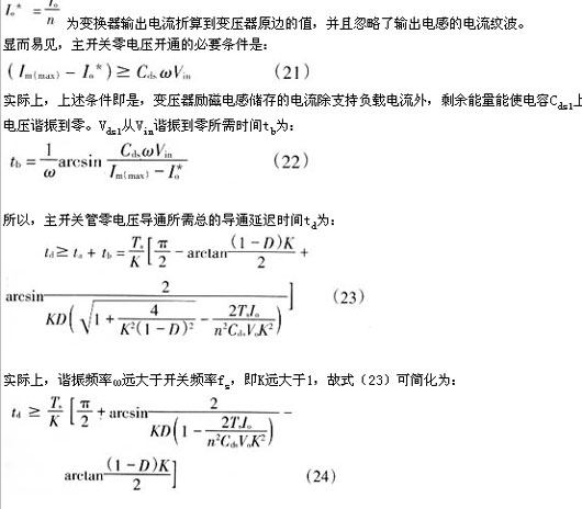 6)設定死區延遲時間td,針對不同的軟開關實現方法,分別從式(21)、(24)或(25)、(26)求出所需的系數k。