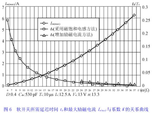 死區延遲時間,意味著pwm變換器有效占空比的損失。為了盡量減小有效占空比的損失,則k必須加大。另一方面,變換器開關頻率fs愈高,則為保持相同的有效占空比,k至少應保持不變,即諧振頻率ω應與開關頻率fs成比例增加。圖6給出了軟開關所需要的死區時間td和最大勵磁電流im(max)與k的關系曲線。從圖中明顯看出,采用加大勵磁電流的方法實現零電壓軟開關和采用磁飽和電感器比較,要求的k較大,因而有較大的勵磁電流損耗;另外,從式(15)看出,開關頻率愈高,電流峰值也愈高,變壓器的銅耗和開關管的導通損耗也愈大。因此,軟開關有源鉗位正激變換器工作頻率不宜太高。