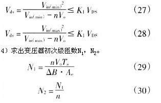 4)據式(29)、(30)求出變壓器初次級匝數n1,n2分別為40匝和3匝。