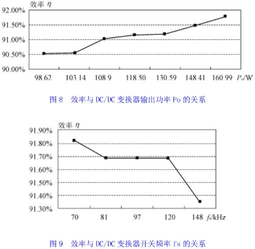圖7(a)、7(b)、7(c)給出了實測的主開關管工作電壓、電流波形。圖7(a)顯示主開關管工作在硬開關狀態。圖7(b)和圖7(c)分別是采用增加勵磁電流方法和應用磁飽和電感器方法實現零電壓軟開關的電壓電流波形,后者明顯地降低了勵磁電流和開關管電流的峰值。實測波形與理論分析完全一致。圖8、9顯示出了實測的效率曲線。從圖9中看出,當變換器開關頻率增加時,變壓器勵磁電流損耗和開關管通態損耗所占比重增加,變換器效率降低了。實驗結果驗證了理論分析。