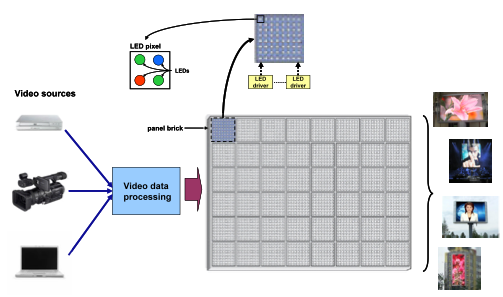 整個顯示屏通常由若干個正方形或矩形的點陣組成,每個點陣又由若干個像素組成。每個像素由RGB (紅、綠、藍)LED燈管組成,通過混合這些LED的燈光顏色,就可產生所需的像素信息。LED驅動器相當于被處理后的視頻數據與RGB LED發出的彩色燈光之間的接口(圖像就是由這些彩色光線構成的)。