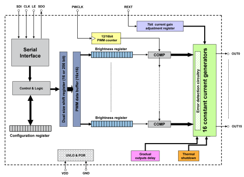 這款產品是一個16通道LED驅動器,內置一個高頻串行數據接口。每路通道的最大輸出電流為60mA,可以通過一個外部電阻器調節輸出電流,使用一個8位增益寄存器可以精確調節256級灰度。