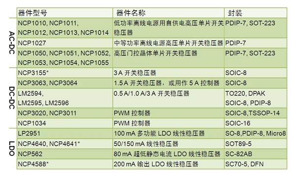 關(guān)穩(wěn)壓器 NCP3155、1.5 A 開關(guān)穩(wěn)壓器 NCP3063/4、0.5/1.0/3 A 開關(guān)穩(wěn)壓器 LM2594/5/6、NCP3020/11 脈寬調(diào)制(PWM)控制器及 NCP1034 PWM 控制器。