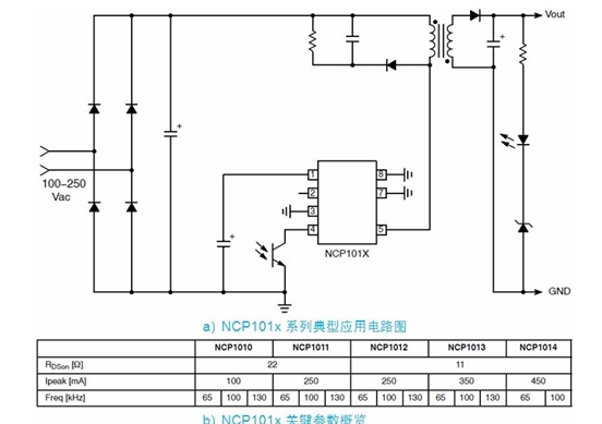 以 NCP101x 為例,這系列器件集成了固定頻率電流模式控制器及典型導(dǎo)通阻抗為 11 或 22 ? 的 700 V MOSFET,提供構(gòu)建強(qiáng)固及低成本開關(guān)電源所需的全部特性,包括軟啟動、頻率抖動、短路保護(hù)、跳周期、最大峰值電流設(shè)定點及動態(tài)自供電(不需要輔助繞 組)等。在正常負(fù)載工作期間,NCP101x 以 65、100 及 130 kHz 中的某一頻率開關(guān);而當(dāng)電流設(shè)定點降到低于某個給定值(如輸出功率需求消失)時,NCP101x 自動進(jìn)入所謂的跳周期模式(在此模式下跳除不需要的開關(guān)周期),從而提供極佳的輕載能效。由于進(jìn)入跳周期模式通常發(fā)生在最大峰值電流的 1/4 時,故沒有可聽噪聲產(chǎn)生。因此,待機(jī)能耗降至最低,且沒有可聽噪聲產(chǎn)生。NCP101x 典型應(yīng)用電路及不同型號的關(guān)鍵參數(shù)參見圖 2。