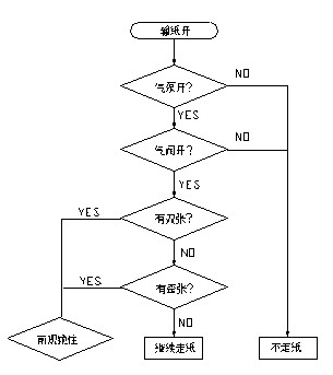 印刷機(jī)整體的電氣設(shè)計還是比較復(fù)雜的,對時間的要求也很嚴(yán)格。在機(jī)器的很多地方裝有接近開關(guān),用來檢測不同的時間點。在印刷過程中,走紙的好壞是影響機(jī)器質(zhì)量的一個重要環(huán)節(jié)。所謂紙走的好壞,指的是無歪張,雙張等現(xiàn)象,如果有歪張,雙張現(xiàn)象,在高速情況下,就會將走壞的紙,卷入機(jī)器內(nèi),從而破壞膠皮,給用戶帶來很大損失。此過程流程如下:
