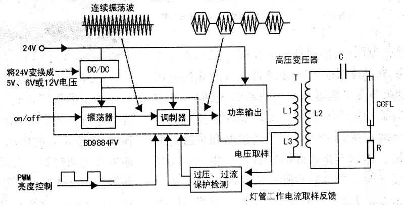 在液晶電視機(jī)中,背光燈驅(qū)動板是一個單獨工作且受控于CPU的電路組件,其主要作用是點亮液晶屏內(nèi)的背光燈管,并在CPU的控制下進(jìn)行啟動、停止(on/off)及亮度調(diào)節(jié)。