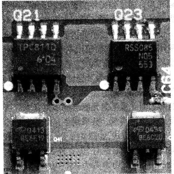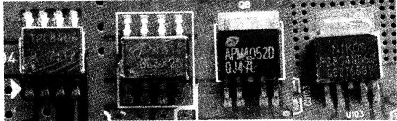 背光燈驅(qū)動板主要由振蕩器、調(diào)制器、功率輸出電路及保護(hù)檢測電路組成,如1圖所示。在實際電路中,除功率輸出部分和檢測保護(hù)部分外,振蕩器、調(diào)制器及控制部分通常由一塊單片集成電路完成,這類集成電路常用的主要有BD(Rohm公司生產(chǎn),如BD9884FV、BD9766等)及OZ系列(凹凸微電子公司生產(chǎn),如02960、02964等);功率輸出管多采用互補(bǔ)的功率型場效應(yīng)管,有的采用3腳和8腳(①~③腳為S極,④腳為G極,⑤-⑧腳為D極)貼片封裝型,常見型號有D454、RSS085、D413、TPC8110、FDD6635.FDD6637等,如圖2所示;還有的采用由N溝道和P溝道組合的5腳或8腳MOSFET功率塊(①腳為Sl極,②腳為Gl極,③腳為S2極,④腳為G2極,⑤~⑧腳為D1、D2極),如SP8M3、TPC8406、4614、APM40520、P2804ND5G等,如圖3所示。保護(hù)檢測多由集成電路10393、358、393或LM324及其外圍元件來完成。輸出電路主要由高壓變壓器、諧振電容及背光燈管組成,并設(shè)有輸出電壓、輸出電流取樣電路。