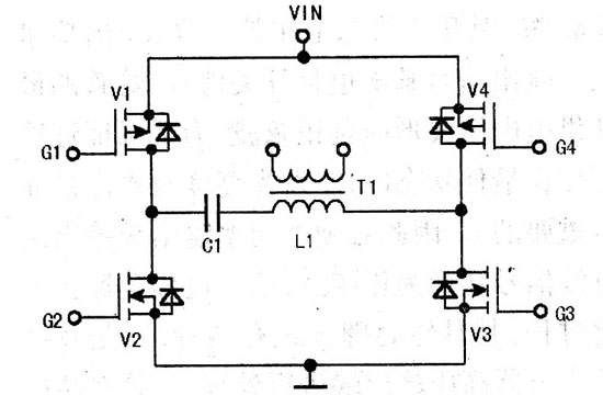 在低壓輸入端正弦化處理的功率驅(qū)動電路簡圖如圖12所示,Vl、V4為P溝道MOSFET管,V2、V3為N溝道MOSFET管,電容Cl與高壓變壓器Tl的初級繞組Ll串聯(lián)。該功率驅(qū)動電路的4路激勵脈沖如圖13所示。