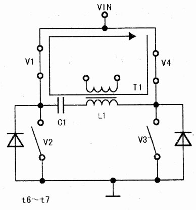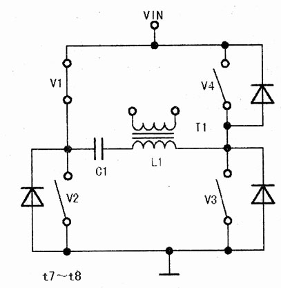 在t7~t8期間,V1導(dǎo)通,V2~V4截止,L1中無電流流過,如圖21所示。