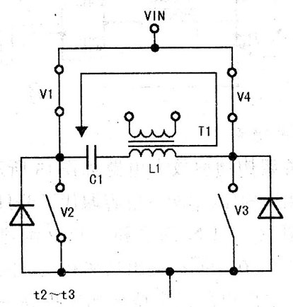 在t2~t3期間,V1、V4導(dǎo)通,V2、V3截止,L1與Cl諧振,Ll中儲存的電能通過Vl、V4給C1充電,流過Ll的電流逐漸減小,其電流回路如圖16所示。