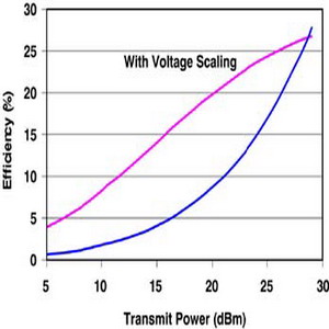 動態/可適性電壓調整技術(DVS/AVS)與高整合度組件所使用的方式很類似,它會把閉回路系統中的處理器和穩壓器連結在一起,并在確保系統正常工作的情形下,將數字電源供應的輸出電壓動態調整至最小值。功率放大器會被最佳化,使它在最大傳送功率下擁有最高效率。由于絕大多數手機都在基地臺附近工作,手機的無線電功能會在維持通訊質量的前題下,將傳送功率降至最低水平。當功率放大器在較低的功率水平下工作時,它的效率會受到影響,從(圖三)可以看出,利用動態電壓調整技術來調整功率放大器的電壓,它的工作效率會增加10%至20%。