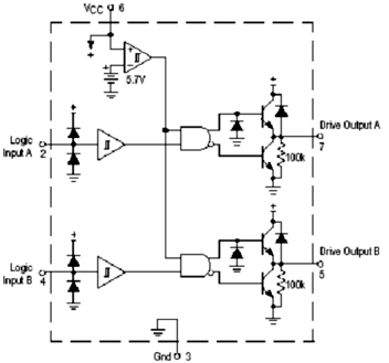MC34152的外圍電路簡單,應用方便。它是8管腳的同相推挽驅動芯片,具體的內部結構和封裝如圖4所示。2,4腳為兩路控制信號輸入,經過芯片內部的推挽放大,直接輸出同相的兩路驅動信號(7,5腳)。為使芯片更加穩定地工作,一般在芯片的電源端并聯一個濾去高頻干擾的瓷片電容和一個濾去低頻干擾的電解電容。