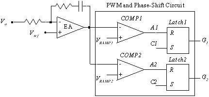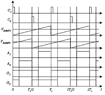 如圖3所示,時鐘信號C1和C2相差180度,它們分別對應的鋸 VRAMP1 和 VRAMP2 也相差180度,電壓誤差放大器的輸出信號 VEA、Vo 分別與 VRAMP1 和 VRAMP2 相比較,再通過兩個RS觸發器得到相差180度的驅動信號 G1 和 G2 。