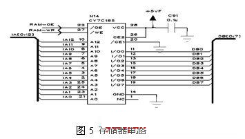 通過(guò)軟件參與設(shè)置,很容易得到全頻段內(nèi)的預(yù)置誤差數(shù)據(jù)。對(duì)于2-20GHz的微波振蕩器,如果每隔5MHz設(shè)置補(bǔ)償一個(gè)點(diǎn),那么存儲(chǔ)器至少需要3600個(gè)地址空間,在此選擇8k×8靜態(tài)存儲(chǔ)器芯片,存儲(chǔ)空間滿足要求。在時(shí)鐘的同步控制下,地址生成器產(chǎn)生對(duì)應(yīng)地址,該系列數(shù)據(jù)被存入RAM中,電路如圖5所示。