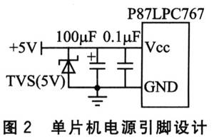 單片機(jī)工作電源和系統(tǒng)其他電路電源分開設(shè)計(jì),避免其他電路對(duì)單片機(jī)工作電源產(chǎn)生影響,單片機(jī)工作電源設(shè)計(jì)留有足夠的余量,防止電源的波動(dòng)影響單片機(jī)工作。在設(shè)計(jì)PCB板時(shí),在單片機(jī)電源引腳接電容和瞬態(tài)電壓抑制器(TVS),如圖2所示。100 μF電解電容存儲(chǔ)的能量在電源波動(dòng)時(shí)(降低)釋放出來,保持電源穩(wěn)定;0.1μF的高頻電容可以吸收電源上的高頻干擾;TVS吸收瞬態(tài)浪涌功率,使兩極間的電壓箝位于一個(gè)預(yù)定值,保持單片機(jī)工作電源穩(wěn)定。