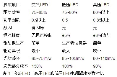 低壓LED驅(qū)動(dòng)電源是從開光電源原邊反饋電路移植過(guò)來(lái)的產(chǎn)物,設(shè)計(jì)電路復(fù)雜,恒流精度誤差較大。小功率開關(guān)電源驅(qū)動(dòng)方式驅(qū)動(dòng)效率充其量設(shè)計(jì)到80%,LED應(yīng)用開始要求功率因數(shù),小功率電源并不具備。器件壽命受到限制,內(nèi)置電源體積也受限,市場(chǎng)機(jī)會(huì)因此受到局限。 高壓LED是因上述問(wèn)題而誕生的產(chǎn)物,集交流LED和低壓LED之優(yōu)點(diǎn),驅(qū)動(dòng)效率及恒流精度大大提升,各項(xiàng)參數(shù)均優(yōu)秀,性能價(jià)格比高。