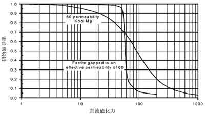 此外,電感磁芯材料也是選擇電感時(shí)應(yīng)該加以考慮的重要因素。常用的磁芯材料分為兩大類,一類是粉狀磁芯,以鐵粉芯、High Flux高磁通磁粉芯以及Kool Mμ為代表;另一類是鐵氧體磁芯。兩種磁芯材料各有優(yōu)缺點(diǎn),設(shè)計(jì)人員在選擇的時(shí)候,應(yīng)根據(jù)成本、性能、尺寸等因素綜合考慮進(jìn)行選擇。相對粉狀磁芯電感,鐵氧體磁芯的電感具有較低的磁芯損耗,同時(shí)具有較高的開關(guān)頻率(高達(dá)MHz)。因此,鐵氧體磁芯通常是此類應(yīng)用的最佳選擇。當(dāng)然,鐵粉磁芯也有其優(yōu)越性,例如鐵粉磁芯的成本相對鐵氧體要低得多;另外,粉狀磁芯的電感隨著流過電感的直流偏置電流的變大要下降得緩慢些,相當(dāng)于具有“軟”飽和特性,而鐵氧體磁芯的電感值在飽和以后就會(huì)迅速下降(見圖1),因此在設(shè)計(jì)的時(shí)候需要留有更多的余量,防止電感出現(xiàn)飽和。如圖1所示,粉狀磁芯的電感值隨著負(fù)載電流的增大下降相對緩慢。鐵粉磁芯往往是用于一些對功耗要求不甚敏感,開關(guān)頻率也不高(<200kHz),但注重成本的應(yīng)用場合。