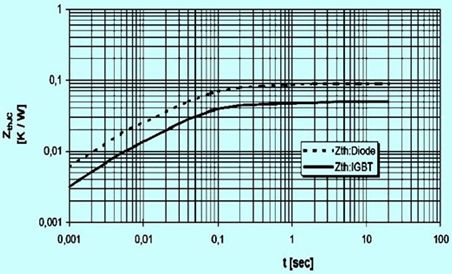 通常處于周期性脈沖功耗負載下的平均和最大結(jié)溫可以參考廠家所給出的瞬態(tài)熱阻曲線來計算。如圖3示出了eupc型號為bsm400ga120dlc的igbt模塊瞬態(tài)熱阻曲線zthjc=f(t)。
