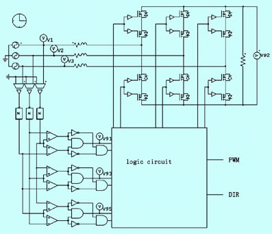 虛擬整流技術的實現,主要通過三相同步檢測電路取得同步控制信號,然后控制功率器件來模擬二極管橋式整流電路對三相交流電進行整流,同時防止輸入的三相交流電相間短路。其原理如圖9所示,是一個輸出方向固定的虛擬整流電路。仿真波形如圖5所示,它們分別是矩陣變換單元的三相輸入電壓、6路同步信號和虛擬整流后得到的輸出電壓波形。