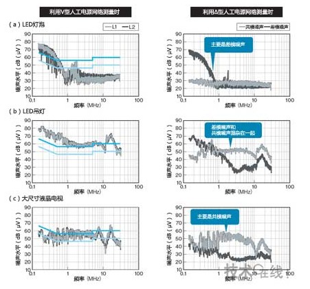電子產品的種類變了,噪聲成分的構成也會變化。例如,LED燈泡主要是差模噪聲,LED吊燈中差模噪聲和共模噪聲混在一起(a,b)。而大尺寸液晶電視主要是共模噪聲(c)。