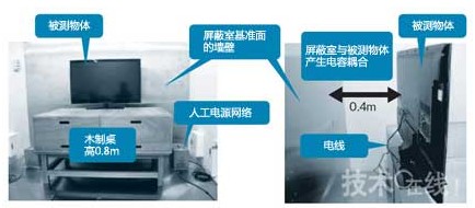 傳導噪聲的測量在屏蔽室內進行。測量條件由“CISPR16-2”或“ANSI63-4”等標準規定。兩種標準中規定,屏蔽室的基準面與被測物體的距離要保持在0.4m,連接人工電源網絡和被測物體的電線長度為0.8m,被測物體設置在高0.8m的臺子上(圖5)。
