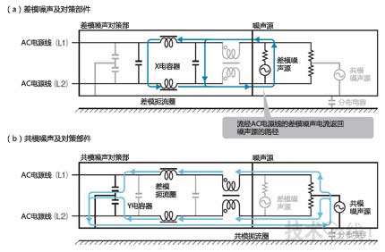 利用差模扼流圈能提高AC電源線的阻抗,使噪聲電流不易流動。然后在此基礎上,利用X電容降低AC電源線間的阻抗,使噪聲電流返回噪聲源。該方法可防止電磁噪聲傳導至產品以外。