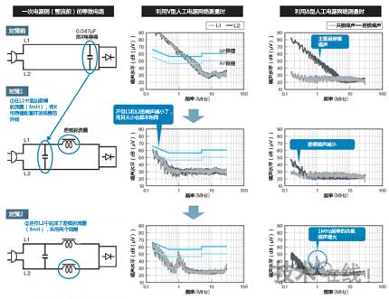 如上所述,抑制噪聲的效果會因噪聲電流流過路徑的電容和電感與噪聲對策元件之間的相互作用而大幅變化。