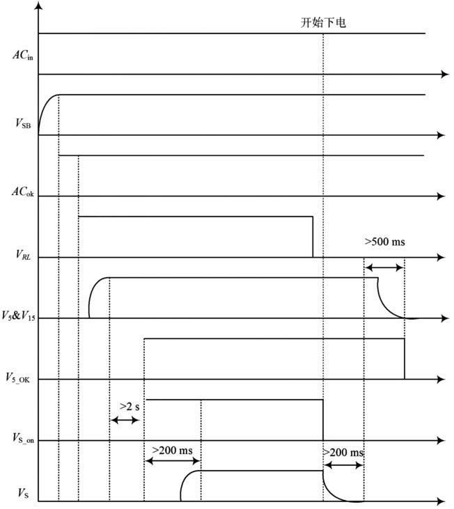 PDP電源在工作時,具有嚴格的開機時序和關機時序。當插上整機電源插頭后,輸出待機電源VSB,同時交流信號檢測ACOK=1.此時按下開關。數字電路CPU向電源發出電源控制信號,使VRL =1,電源向各種邏輯電路、控制電路、保護電路提供+5V,+15V電源,然后將V5_ok置1.當電源檢測信號V5_ok=1時,數字電路CPU向電源發出VS_on=1.PDP電源向顯示系統提供180V高壓。關機時,先關掉高壓電源,然后再關掉+5 V,+15 V 電壓。工作時序如圖2所示。