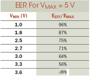 其中EMAX代表電容器存儲的總能量。等式2明確表明,隨著我們通過減少電容器內的駐留電能,而降低了被供電電路的最低工作電壓VMIN,有效能效比可獲得極大地提升。對任何以電容供電的電路來說,能效比都是一個非常重要的設計考慮。