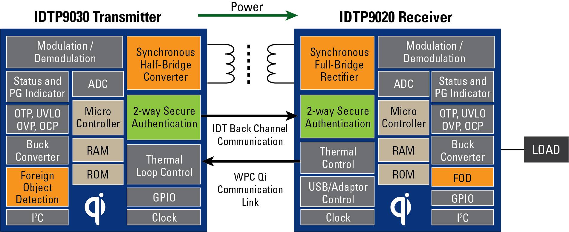 IDTP9030 和 IDTP9020 提供了無線電源發送器和接收器解決方案,專為滿足無線充電聯盟(WPC)的 Qi 標準而設計,可保證與其他滿足 WPC Qi 標準器件的互操作性。發送器和接收器均能夠進行“多模式”操作,可支持 Qi 標準和專用格式以增加功能、改進安全和提高功率輸出能力。內置的協議檢測可實現 Qi 與專用模式間的動態轉換,從而實現平穩過渡和可靠的用戶體驗。這些器件可用于大量移動應用以進行便利和輕松的電池充電。