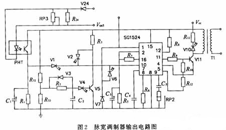 當(dāng)負(fù)載過(guò)流時(shí),經(jīng)脈沖變壓器次級(jí)耦合,其初級(jí)也過(guò)流,流過(guò)R24的壓降增大,光耦PHT導(dǎo)通,SG1524的10腳電壓被抬高,SG1524關(guān)閉,無(wú)輸出電壓,從而保護(hù)電源。