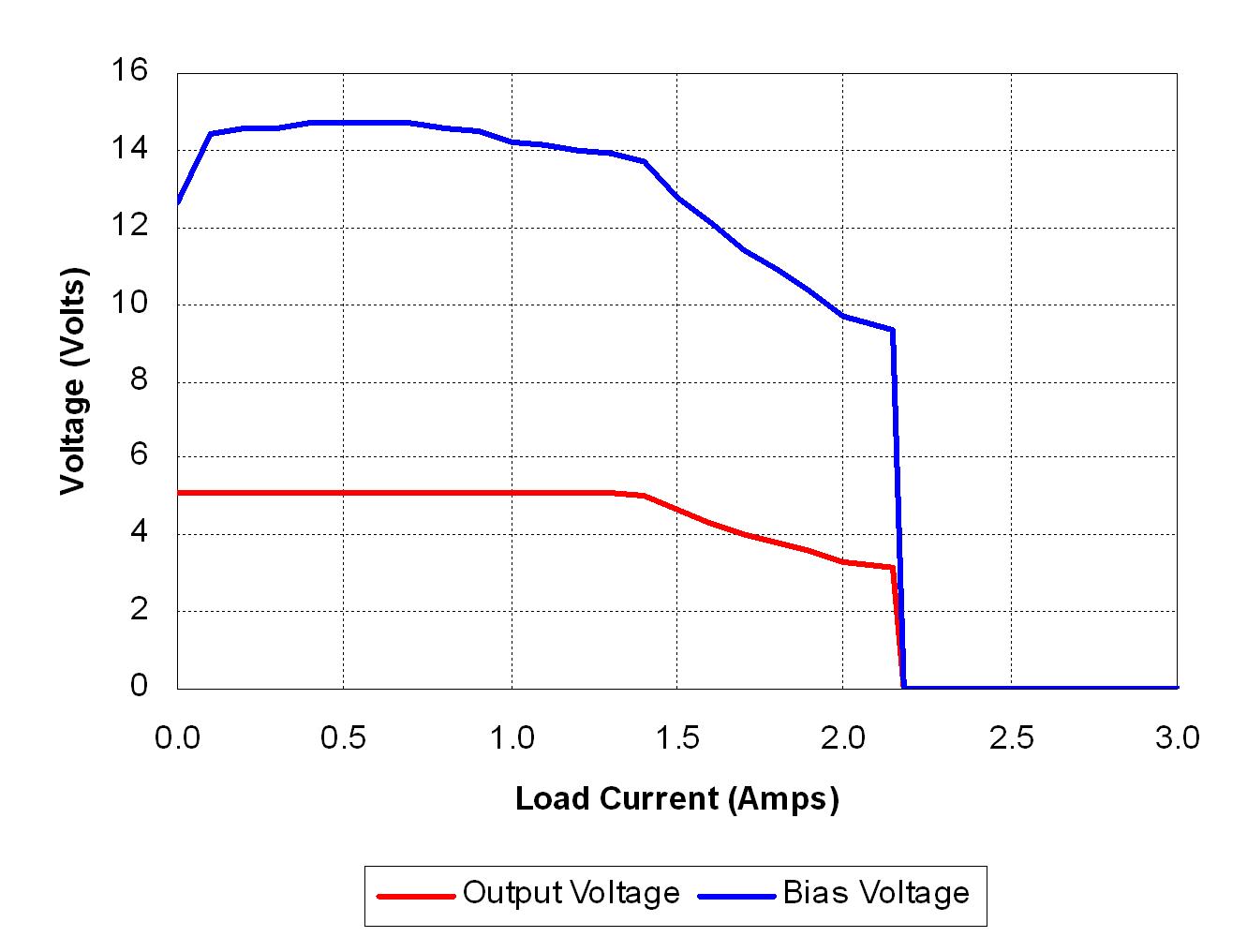 圖3顯示了輸出和偏置電壓與圖2所示電路負(fù)載電流的對(duì)比情況。輸出V-I特性非常接近于圖1所示理想情況。負(fù)載電流達(dá)到約1.3A時(shí)開(kāi)始功率限制。隨著負(fù)載增加,輸出電壓開(kāi)始下降。由于偏置電壓是輸出電壓的反映,因此它也開(kāi)始下降。偏置電壓降至9V關(guān)閉水平以下時(shí),PWM控制器關(guān)閉。
