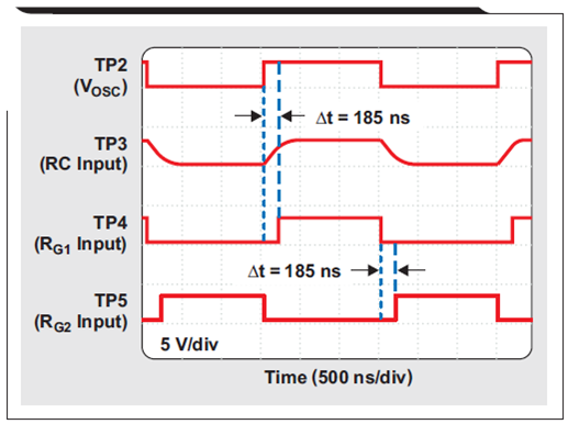 著名的三反相門振蕩器由 U1a、U2a 和 U2b 組成,選擇它是因為它在供電波動方面較為穩定。通過一個 100-pF 陶瓷電容器(COSC)和兩個 10-kΩ 電阻器(ROSC1 和 ROSC2),它的正常頻率被設定為 330kHz。在 3.0-V 到 3.6-V 電源電壓波動范圍內,振蕩器擁有接近 50% 的占空比,以及低于 ±1.5% 的最大頻率波動。圖 2 顯示了 ROSC1 和 ROSC2 (TP1) 相加點和振蕩器輸出 (TP2) 處的波形。所有電壓均為參考電路基準電壓測得。[page]