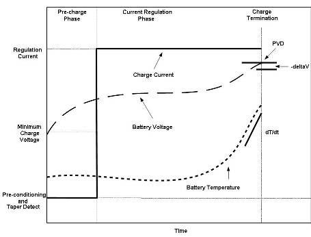 就鎳基可充電電池而言,快速充電終止基于電壓或溫度。如圖 1 所示,典型的電壓終止方法是峰值電壓探測,在峰值時即每個電池的電壓在 0~-4mV 范圍內(nèi),快速充電被終止。基于溫度的快速充電終止方法是觀察電池溫度上升率 來探測完全充電。典型的 率為 1℃/每分鐘。