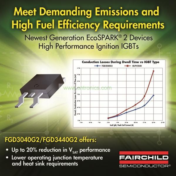 為了滿足現(xiàn)今和新興點(diǎn)火系統(tǒng)對排放和高燃油效率的嚴(yán)苛要求,汽車設(shè)計(jì)人員需要更高性能的點(diǎn)火線圈驅(qū)動(dòng)器技術(shù)。為幫助設(shè)計(jì)人員滿足這些要求,飛兆半導(dǎo)體公司推出了在較小的占位面積下具有更低功耗的最新一代點(diǎn)火IGBT器件。EcoSPARK2、FGD3040G2和FDG3440G2點(diǎn)火線圈驅(qū)動(dòng)器可將VSAT降低多達(dá)20%,而不會(huì)顯著降低自箝位感性負(fù)載開關(guān)(Self Clamping Inductive Switching, SCIS) 的能量。這項(xiàng)優(yōu)化特性減低了功耗和工作結(jié)溫,并降低了對散熱器的要求。