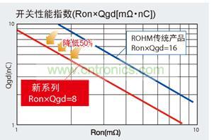 進一步微細化,同時,采用羅姆獨家的低容量構造和新的“溝槽式場板結構”,實現了低容量與低導通電阻兼備的元件。與羅姆傳統產品相比,表示功率MOSFET的性能指數的“FOM”數值可降低50%。