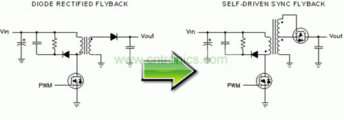 在自驅動同步反向電源中,輸出二極管被一個 N 通道 MOSFET 代替,同時必須向電源變壓器添加一個繞組以生成同步柵極驅動信號。相比輸出二極管整流器,該同步MOSFET的低導通電阻可帶來更低的傳導損耗,這就極大地提高了高負載電流時的效率。