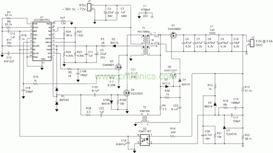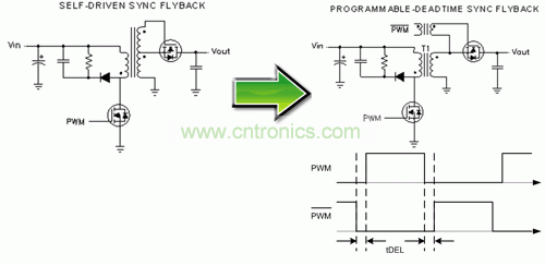 圖 3 顯示了一個具有可編程延遲的隔離柵極驅動信號如何被添加到同步反向結構中以消除直通損耗。通過柵極驅動變壓器,可以實現(xiàn)隔離和電平變換。必須使用擁有較好驅動輸出和可調節(jié)延遲的 PWM 控制器(例如:UCC2897),以便對一次側和二次側同步 MOSFET 進行控制。延遲必須足夠長,以確保同步 MOSFET 能夠在一次側 MOSFET 開啟以前被完全關閉。然而,延遲太長會引起一個或兩個 MOSFET 上出現(xiàn)主體二極管傳導,并導致過多的功率損耗。由于最佳停滯時間取決于一次側和二次側 MOSFET 延遲時間、轉換速度、電源變壓器漏電感以及柵極驅動電路,因此可調節(jié)延遲時間控制器對最小化損耗至關重要。