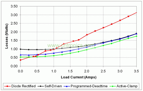 圖 6 顯示了每次二極管整流反向結構升級對實際設計效率的提升程度。電源將一個遠距通信 48VDC 輸入轉換為一個 3.5A 最大負載電流的 3.3V 輸出。將一個二極管整流器轉換為一個自驅動同步反向結構使最大負載效率提高超過 7%,但也確實降低了 1A 以下輸出電流的輕負載效率。這是由于同步 MOSFET 帶來了柵極驅動損耗、開關損耗和直通損耗。如圖 7 所示,輕負載狀態(tài)下這些損耗在總損耗中占較大百分比,從而降低了輕負載的效率。使用可編程延遲消除了直通損耗,從而極大地提高了輕負載的效率,如圖 7 所示。由于其他電路損耗在同步 MOSFET 損耗中占主導地位,因此滿負載效率保持基本不變。最終,有源鉗位的實施提高了所有負載條件下 3.3V 電源的效率。