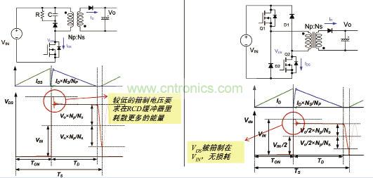 雙管反激的好處之一就是減少能量損耗。無緩沖器損耗和發熱問題,漏電感能量可回收在大容量電容器中。