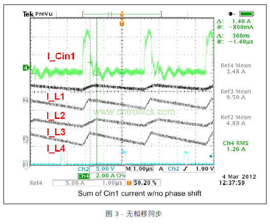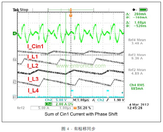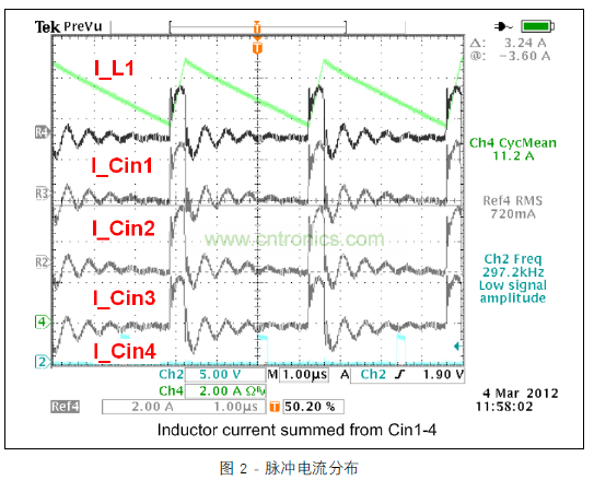 圖 3 顯示的范圍圖片涵蓋所有四個開關階段中的電感器電流與去耦合通道 1 的輸入電容器的脈沖電流。