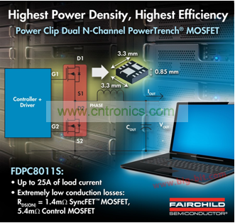 張瑞斌向記者介紹:“FDPC8011S專為更高的開關頻率的應用而開發,在一個采用全Clip封裝內集成1.4m? SyncFETTM 技術和一個5.4m?控制MOSFET、低質量因子的N溝道MOSFET,有助于減少同步降壓應用中的電容數量并減小電感尺寸。該器件具有源極朝下和低側MOSFET可以實現簡單的布局和布線,提供更緊湊的線路板布局并獲得最佳的散熱性能。”FDPC8011S具有超過25A的輸出電流,與其它普通3x3mm2 雙MOSFET器件相比,輸出電流容量提高了2倍。
