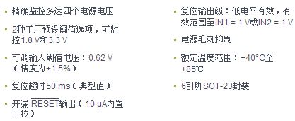 如果某一受監控的電源電壓降至最小電壓閾值以下,就會有一個低電平有效輸出置位,觸發系統復位。輸出為開漏式,具有典型值為10 μA的較弱內部上拉電流,以便拉至受監控的IN2電源電壓。所有電壓均超過選定的閾值電平時,