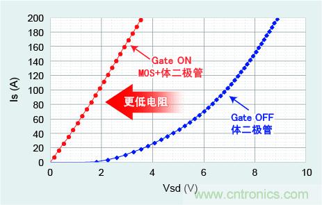 一般Si-IGBT元件無法逆向導通,而SiC-MOSFET可通過體二極管實現常時逆向導通。另外,通過輸入柵極信號,還可實現MOSFET的逆向導通,與二極管相比,可實現更低電阻。通過這些逆向導通特性,與二極管整流方式相比,可在1000V以上的范圍采用高效同步整流方式的技術。