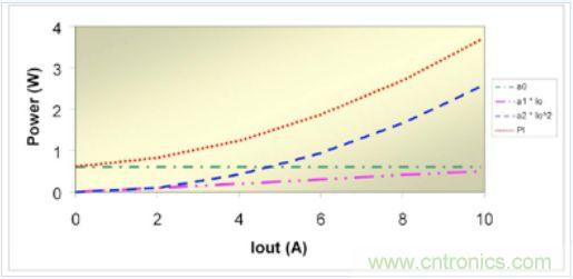 如果意識到電源損耗與輸出電流相關(可用輸出電流替換 X),那么系數項就能很好地與不同來源的電源功率損耗聯系起來。例如,ao 代表諸如柵極驅動、偏壓電源和磁芯的固定開銷損耗以及功率晶體管 Coss 充電與放電之類的損耗。這些損耗與輸出電流無關。第二項相關聯的損耗 a1 直接與輸出電流相關,其典型表現為輸出二極管損耗和開關損耗。在輸出二極管中,大多數損耗是由于結電壓引起的,因此損耗會隨著輸出電流成比例地增加。