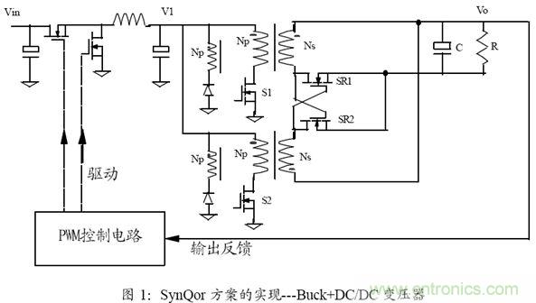 標準DC/DC 二次電源(半磚,1/4 磚)模塊,采用了Buck 與DC/DC 變壓器相級聯的兩級電路方案,如圖(1)所示。初初一看,這個方案比單級方案(如有源箝位正激電路)的元器件數要多,不太合理。但通過分析,可以發現:其功率器件的總數并沒有增加(因為在低壓大電流輸出的應用場合,輸出同步整流MOSFET 即使在單級方案中也要多個并聯才能實現效率指標);磁芯和電容元件的總面積也沒有增加(因為可以用更小的磁芯和電容)。但由于兩級方案容易優化和設計,故模塊的電氣性能得到了極大的改善,具體分析見下面的介紹。
