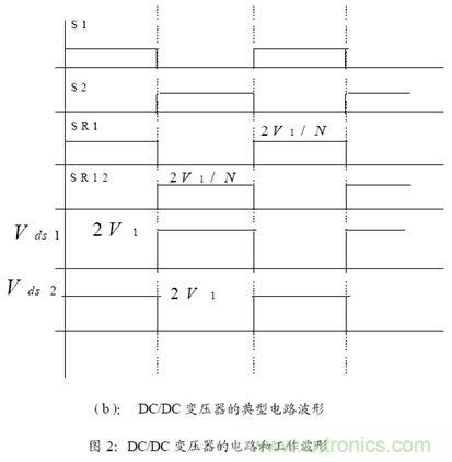 這個方案的第一級是一個同步整流Buck 變換器,它將不穩定的輸入電壓,調整到后級DC/DC 變壓器所合適的輸入電壓,通過反饋輸出和誤差放大等,去控制Buck 變換器的PWM占空比,從而穩定輸出。DC/DC 變壓器的電路和工作波形如圖2 所示: