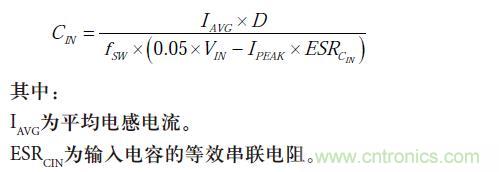 注意,輸入電流在反相降壓/升壓拓?fù)浣Y(jié)構(gòu)中也是非連續(xù)的。假設(shè)在接通時(shí)輸入電容的能量損耗所引起的輸入電壓偏差小于輸入電壓的5%,則通過下式可計(jì)算滿足此要求的最小輸入電容。