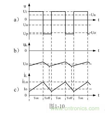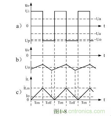 順便指出,反轉式串聯開關電源輸出電壓為負脈沖,當圖1-7中的濾波電容器C開路時,負脈沖的幅度將非常高,負脈沖是一個幅度按指數規律下降的尖脈沖,其幅度主要由負載電阻的大小,以及占空比來決定;當圖7中的濾波電容器C接入后,反轉式串聯開關電源輸出電壓uo為一負方波,此方波我們可稱之為半波平均值,關于半波平均值的概念我們后面還會詳細解釋。