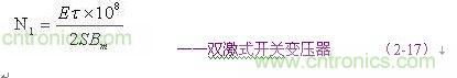 (2-17)和(2-18)式,為計算雙激式開關變壓器初級線圈N1繞組匝數的公式。式中,N1為變壓器初級線圈N1繞組的最少匝數,S為變壓器鐵芯的導磁面積(單位:平方厘米),Bm為變壓器鐵芯的最大磁感應強度(單位:高斯),τ為脈沖寬度,或電源開關管的導通時間(單位:秒),E為脈沖電壓的幅度,單位為伏,F為開關電源的工作頻率,單位赫芝。